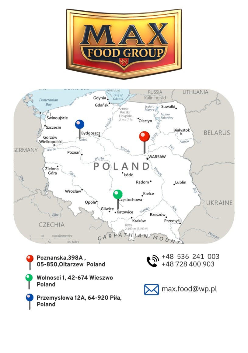 MaxFood operates multiple distribution centers across Poland, strategically located to ensure efficient and timely delivery of food and meat products to our valued customers.